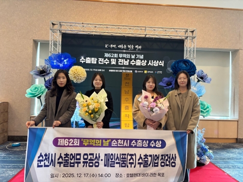 순천시, 제62회 무역의날 기념 수출 업무 유공상 및 수출기업 장려상 수상 순천시 순천시는 17일 목포 현대호텔에서 열린 제62회 무역의 날 기념행사에서 수출업무 유공상 및 수출기업 장려상을 수상했다고 밝혔다. 순천시는 지난 11월 ‘2025년 농수산식품..... 2025-12-18