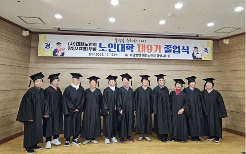(사)대한노인회 광양시지회, 부설 노인대학 제9기 졸업식 개최 광양시 (사)대한노인회 광양시지회(지회장 김종규)는 지난 17일, 광양시지회 회의실에서 부설 노인대학 제9기 졸업식을 개최하고, 교육과정을 성실히 이수한 어르신 12명에게 졸업장을..... 2025-12-18
