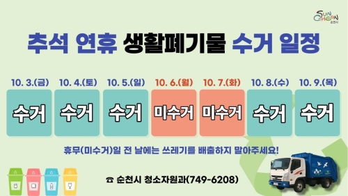 순천시, 추석 연휴 생활폐기물 수집․운반 안정적 추진 순천시 순천시(시장 노관규)는 추석 연휴 기간 생활폐기물로 인한 시민 불편을 최소화하고, 쾌적한 도시 환경을 조성하기 위해 ‘추석 연휴 생활폐기물 수집․운반’을 안정적으로 추진한다..... 2025-09-29