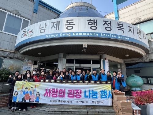 순천시 저전동, 사랑의 김장나눔으로 어려운 이웃에 온정 전해 순천시 순천시 저전동은 지난 27일 저전동 주민자치회와 통장협의회, 마중물보장협의체 위원 등 30여 명이 참여한 가운데 ‘손맛 듬뿍! 저전동 김장담그기’ 행사를 순천시 농산물도매시..... 2025-11-28