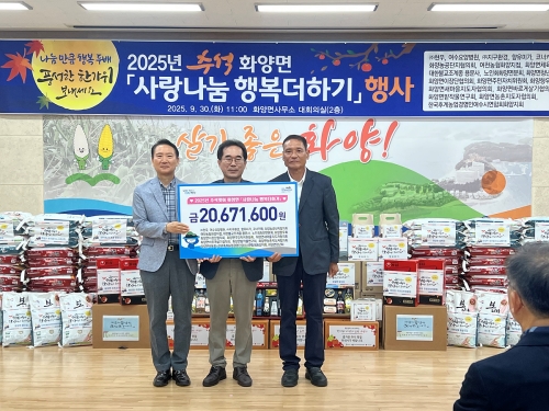 화양면, 추석 맞이 소외계층과 사회복지시설 위한 나눔 행사 개최 여수시 여수시 화양면(면장 최철웅)은 추석을 맞아 지난 30일 면사무소 2층 대회의실에서 관내 소외계층 및 경로당, 사회복지시설을 위한 ‘사랑나눔 행복더하기’ 행사를 개최했다. 이..... 2025-10-02