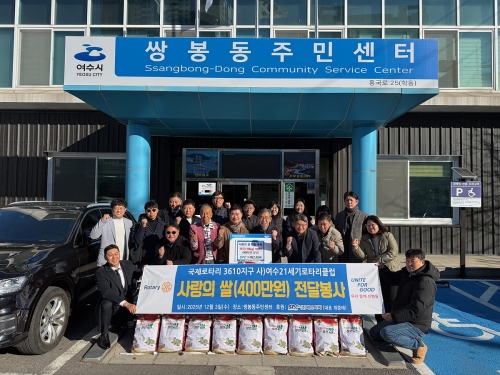 여수21세기로타리클럽, 쌍봉동에 백미 전달 봉사 여수시 여수시 쌍봉동은 국제로타리3610지구 (사)여수21세기로타리클럽이 지난 12월 3일 ㈜에스피씨(대표 최준태)의 후원으로 마련된 백미(10kg) 100포 전달 봉사를 펼쳤다고..... 2025-12-08