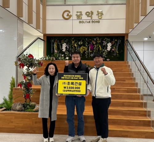 ㈜초록건설, 광양시 골약동 온기나눔 캠페인 동참 광양시 광양시는 지난 12월 8일 ㈜초록건설(대표 손병완)이 ‘전남드래곤즈와 함께하는 희망 Shoot! 나눔 Goal!’ 기부챌린지를 통해 모인 적립금 360만 원을 골약동지역사회..... 2025-12-09