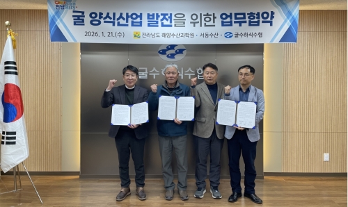 전남해양수산과학원, 어업인과 굴 양식 다각화 연구 협약 전라남도 전라남도해양수산과학원 동부지부 여수지원은 21일 굴수하식수협, 굴 양식어업인과 기후변화 대응 굴 생산성 향상과 양식구조 개선 공동 연구를 위한 업무협약을 했다. 이번 업무..... 2026-01-21