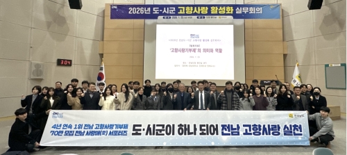 전남도-시군, 고향사랑 활성화 공동 협력 강화 전라남도 전라남도는 23일 22개 시군과 함께 고향사랑기부제 4년 연속 전국 1위, 전남 사랑애(愛) 서포터즈 70만 명 모집 목표 달성을 위한 고향사랑 활성화 실무회의를 열고, ..... 2026-01-23