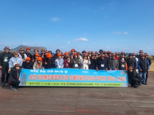 순천시장애인종합복지관 '장애인일자리사업 참여자 제주도 나들이' 진행 순천시장애인종합복지관(관장 정한나)에서는 장애인일자리사업 참여자 제주도 나들이를 지난 11월 24일에서 11월 26일까지 2박 3일간 진행하였다. 이번 나들이는 장애인일자리 참여자..... 2025-11-27