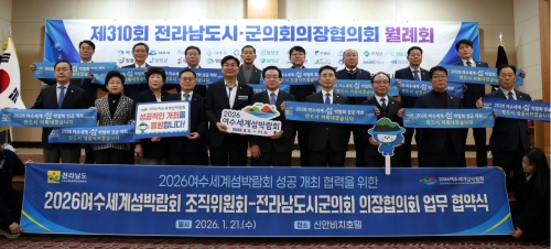 전라남도시군의장협의회–2026여수세계섬박람회조직위 업무협약 체결 전라남도 (재)2026여수세계섬박람회조직위원회(이하 ‘조직위’)는 지난 21일 목포 신안비치호텔에서 전라남도시군의장협의회(이하 ‘의장협의회’)와 ‘2026여수세계섬박람회 성공개최를..... 2026-01-22