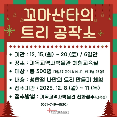 ‘꼬마산타의 트리 공작소’, 순천시 기독교역사박물관에서 만들어요! 순천시 순천시는 다가오는 성탄절을 맞아 기독교역사박물관에서 어린이와 가족이 함께 참여하는 체험 프로그램 ‘꼬마산타의 트리 공작소’를 오는 15일부터 20일까지 운영한다고 밝혔다. ..... 2025-12-08