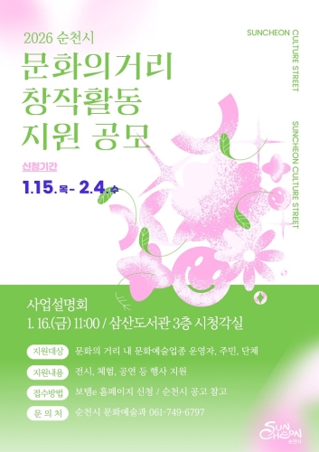 순천시, 문화의 거리 예술창작 활성화 나선다 순천시 순천시는 문화의 거리를 예술특화 거점지역으로 육성하고 지역 예술인의 지속가능한 창작활동을 지원하기 위해 ‘2026년 순천시 문화의 거리 창작활동 지원사업’ 참여자를 공개 모..... 2026-01-15