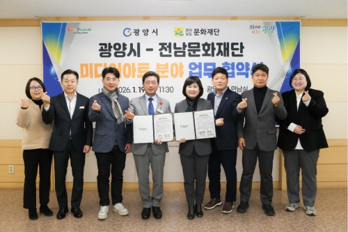 광양시-전남문화재단, 미디어아트 기반 문화예술 협력 업무협약 체결 광양시 광양시는 지난 1월 19일 광양시청 만남실에서 전라남도문화재단과 미디어아트 기반 문화예술 협력을 위한 업무협약을 체결했다고 밝혔다. 이날 협약식에는 김은영 전남문화재단 대표..... 2026-01-20