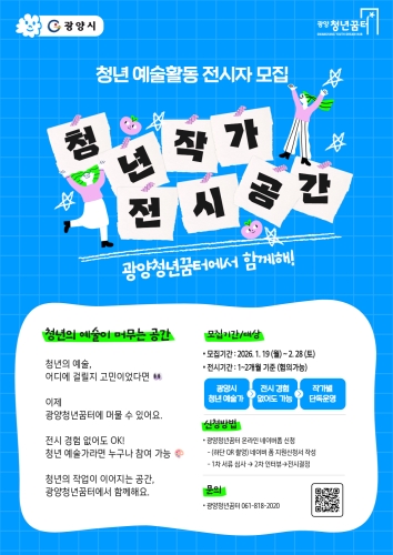 광양시, 광양청년꿈터 내 청년 작가 전시 공간 운영 본격화 광양시 광양시가 청년 예술가의 창작 활동을 지원하고 시민의 문화 향유 기회를 확대하기 위해 ‘광양청년꿈터’ 내에 청년 작가 전시 공간을 본격적으로 운영한다고 밝혔다. 이번 전시 공..... 2026-01-22