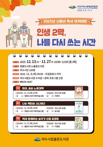 여수시립도서관, ‘2025년 신중년 독서 아카데미’ 운영 여수시 여수시(시장 정기명)는 생애전환기를 맞이하는 중장년층을 위해 ‘2025년 신중년 독서 아카데미’를 오는 11월 13일부터 27일까지 매주 목요일 오전 10시에 운영한다. 이..... 2025-11-06