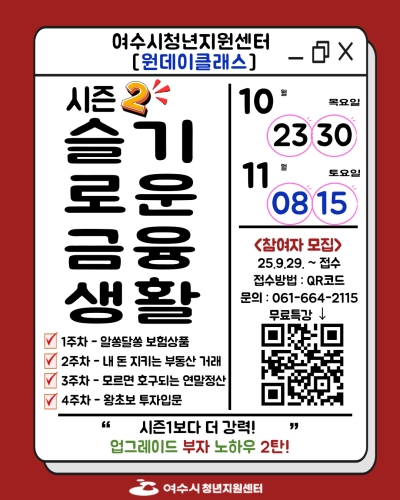 여수시, 청년 대상 ‘시즌2 슬기로운 금융생활’ 무료 특강 운영 여수시 여수시(시장 정기명)는 오는 10월 23일(목) 오후 6시 30분 여수시청년지원센터에서 청년들의 금융 이해도 향상과 건전한 금융 습관 형성을 위한 무료 특강 ‘시즌2 슬기로..... 2025-10-17