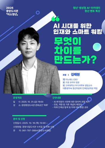 광양중앙도서관, ‘청년 생성형 AI 아카데미’ 수강생 모집 광양시 광양중앙도서관이 청년들의 디지털 활용 역량을 강화하고 창의적 자기계발을 지원하기 위한 프로그램 ‘청년 생성형 AI 아카데미’의 수강생을 모집한다. 이번 프로그램은 빠르게 확..... 2025-10-18