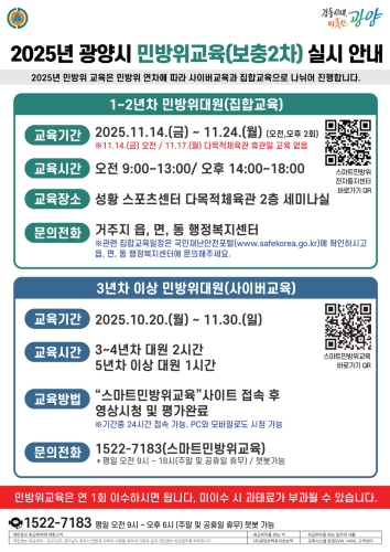 광양시, 2025년 민방위 보충 2차 교육 실시 광양시 광양시는 10월부터 상반기 기본교육을 이수하지 않은 민방위 대원을 대상으로 ‘2025년 민방위 보충 2차 교육’을 실시한다고 밝혔다. 이번 보충 교육은 민방위 대원의 임무와..... 2025-10-21