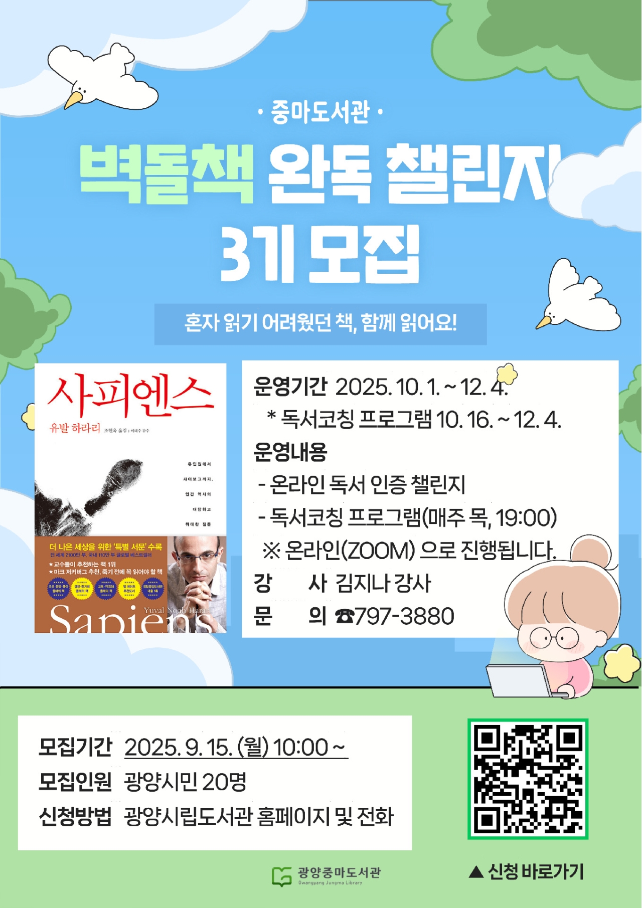 광양중마도서관은 시민들의 깊이 있는 독서 습관 형성을 돕기 위해 오는 10월부터 ‘벽돌책 완독 챌린지’ 3기를 운영한다고 밝혔다.