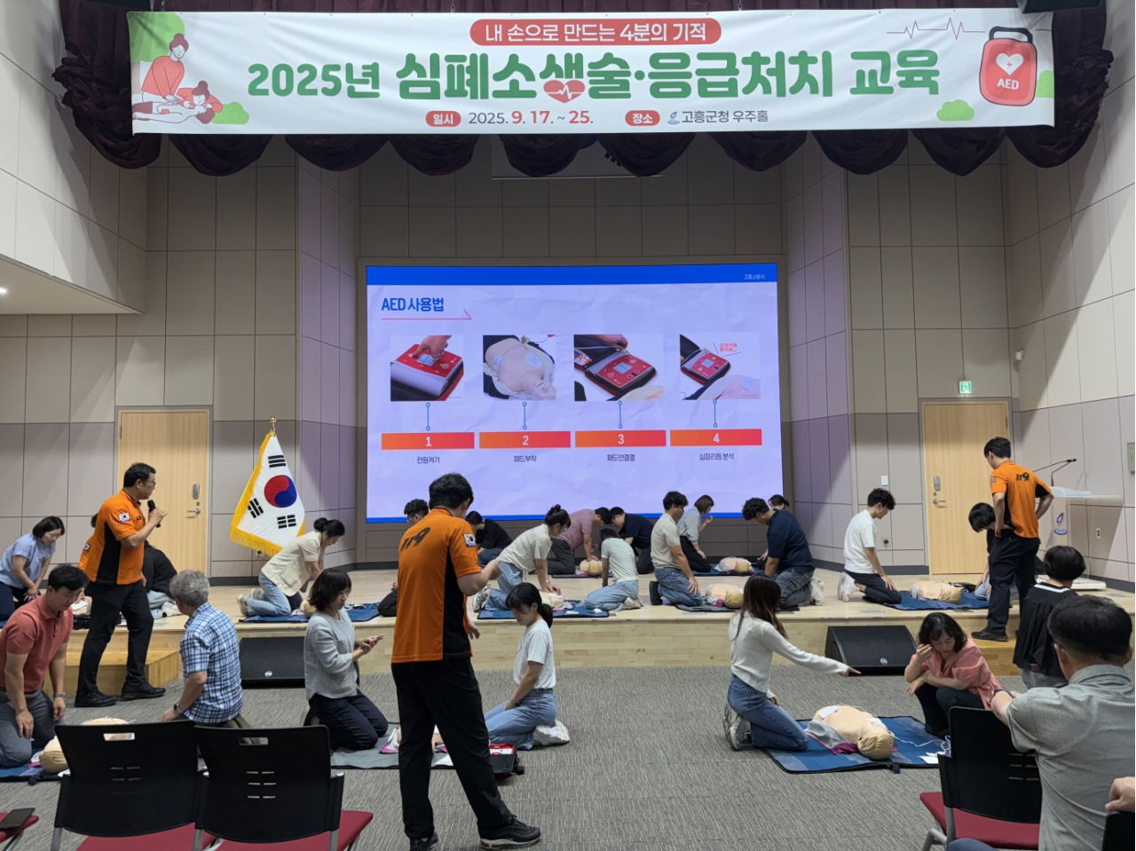 교육은 고흥군청 우주홀에서 총 8회에 걸쳐 진행되며, 전 직원을 대상으로 ▲심폐소생술 ▲자동심장충격기(AED) 사용법 ▲기도 폐쇄 응급처치 요령 등을 포함한 이론과 실습 병행형 프로그램으로 운영된다.
