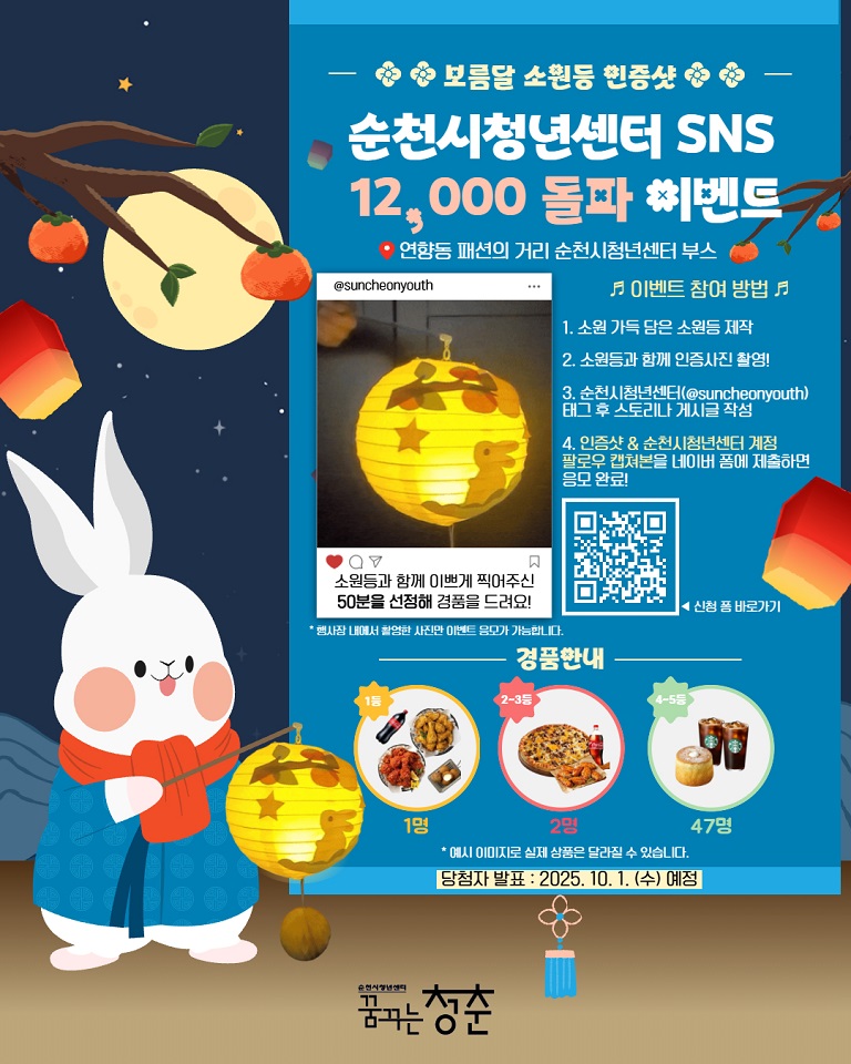 이번 이벤트는 청년센터의 다양한 사업과 프로그램을 알리고, 오는 19~20일에 연향동 패션의 거리에서 개최되는 ‘청년의 날 축제’에 청년들의 참여를 확대하기 위해 추진한다. 참여 대상은 18~45세 청년이며, 청년센터 인스타그램 팔로우 인증과 청년의 날 보름달 소원등 만들기 참여 인증 사진을 네이버 폼을 통해 응모하면 심사를 통해 소정의 경품을 증정할 예정이다.