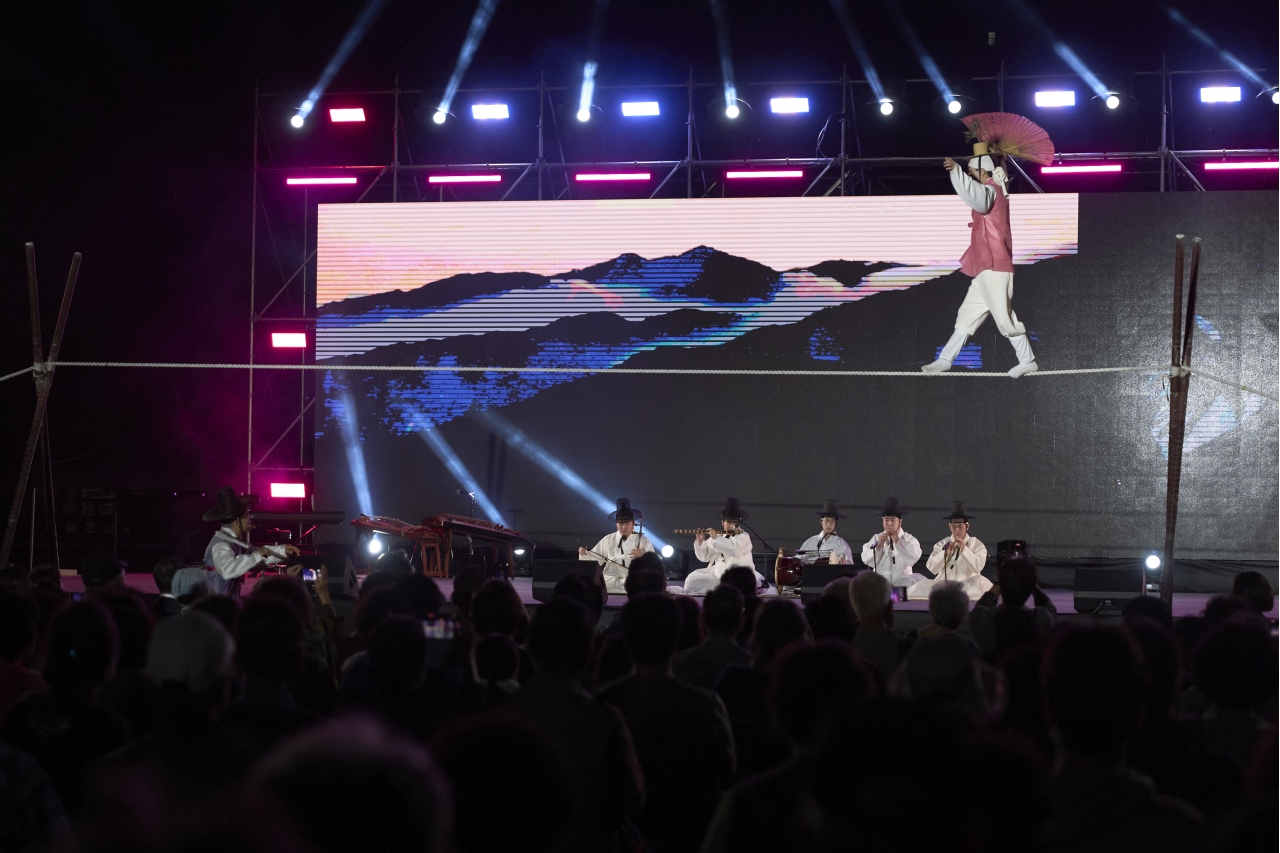 첫날 5일시장에서 펼쳐진 거리공연은 풍물과 마술로 흥을 돋우며 축제의 서막을 열었고, 둘째 날 개막제는 줄광대 공연, 명창들의 판소리, 학춤과 창작 연주가 어우러진 주제공연으로 관객들을 사로잡았다. 특히 성악가 신문희가 선사한 특별공연 「아름다운 나라」는 축제장을 감동으로 물들였다.