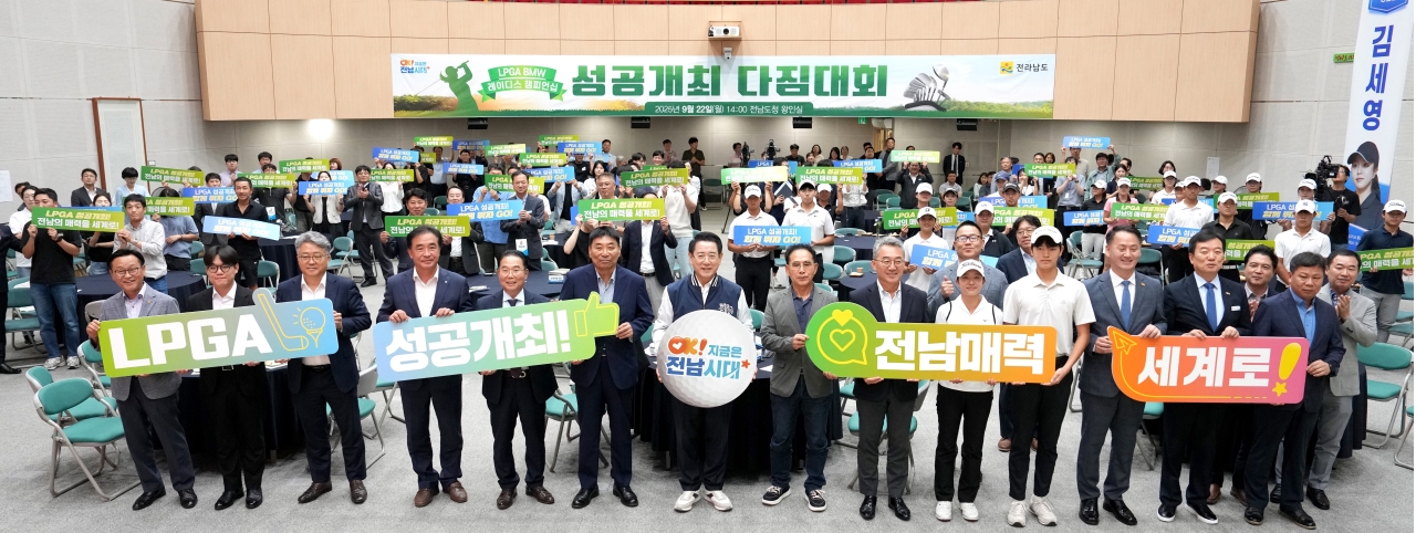 전라남도는 22일 도청에서 김영록 전남도지사, 서남권 6개 시군 음식·숙박·관광업계 대표, 함평골프고 학생, 체육관계자 등 200여 명이 참석한 가운데 LPGA BMW 레이디스 챔피언십 성공개최를 위한 다짐대회를 열었다.