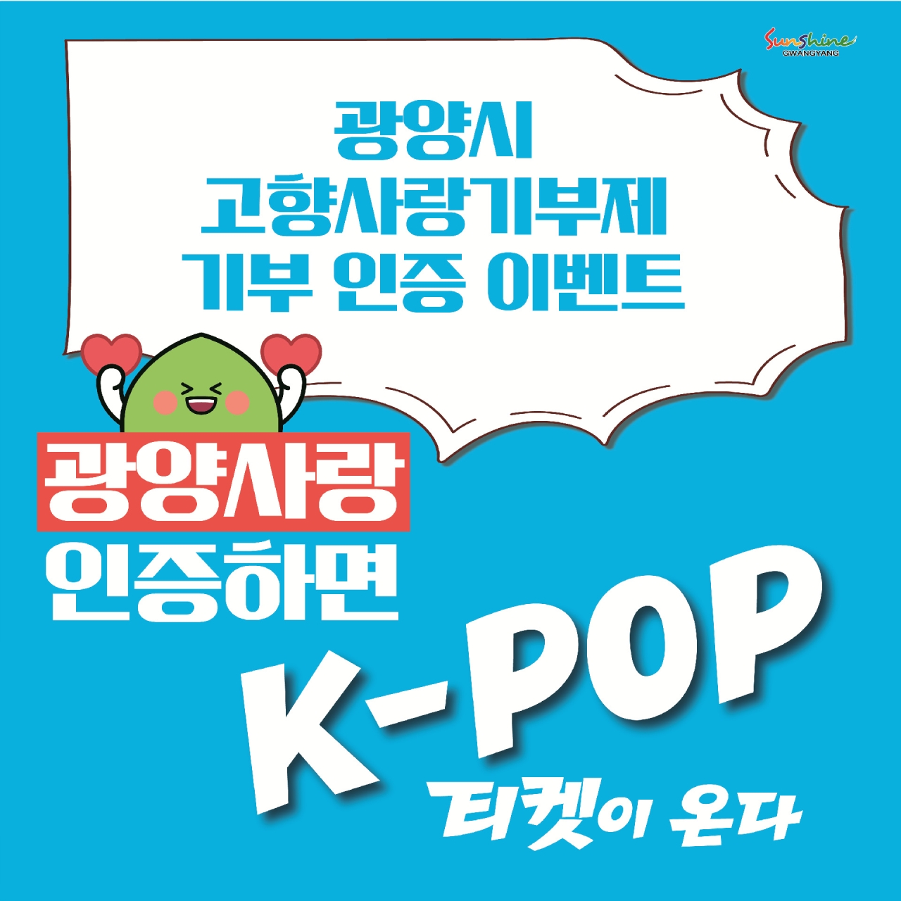 광양시는 오는 9월 29일 오전 10시부터 10월 9일 오후 6시까지 출향인과 방문객이 함께 즐길 수 있는 특별한 인증 이벤트 ‘광양사랑 인증하면 K-POP 티켓이 온다’를 진행한다고 밝혔다.