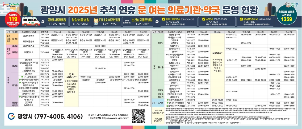 추석 연휴 문 여는 의료기관과 약국 현황은 ▲광양시 모바일 앱 ‘MY광양’ ▲시 누리집(홈페이지) ▲광양시 블로그 등 SNS ▲129 보건복지콜센터를 통해 확인할 수 있다. 스마트폰 애플리케이션 ‘응급의료정보제공’ 에서도 내 주변 병의원, 약국 정보와 상황별 응급처치 요령 등 다양한 의료정보를 확인 가능하다.