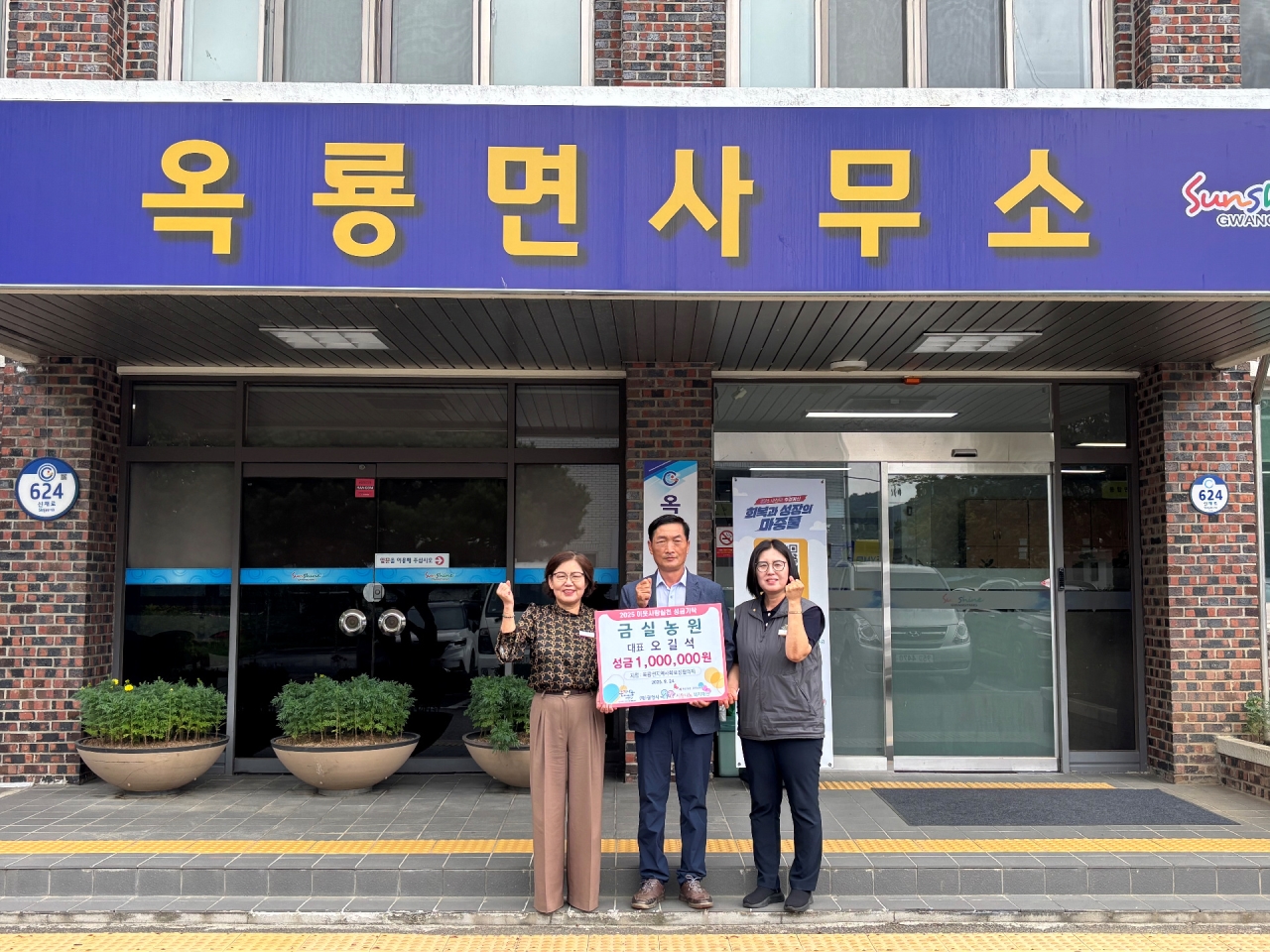 광양시 옥룡면은 오길석 금실농원 대표가 9월 24일 옥룡면사무소에서 열린 기탁식에서 지역사회를 위한 성금 100만 원을 전달했다고 밝혔다.