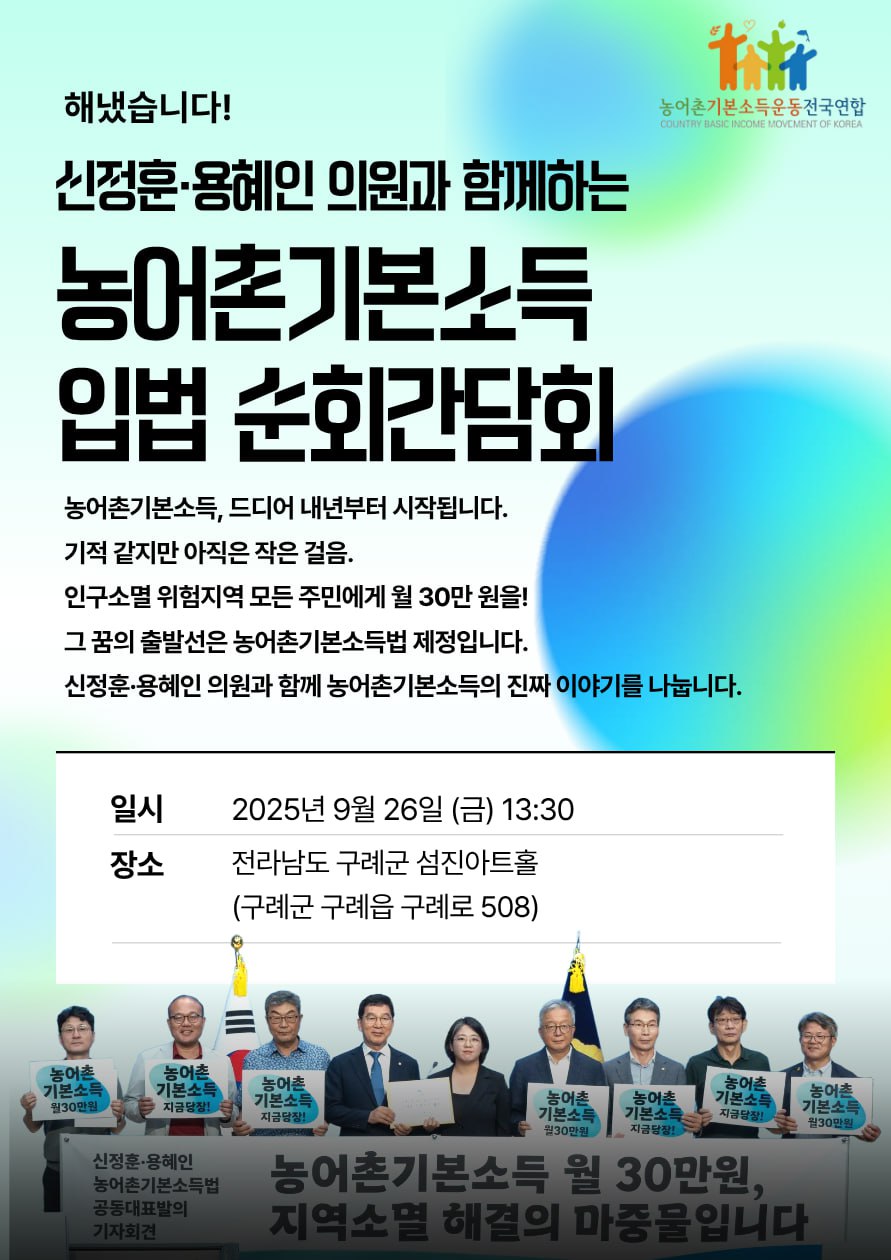 ❍ 국회의원 신정훈·용혜인 의원은 오는 9월 26일(금) 오후 1시 30분 구례섬진아트홀, 9월 27일(토) 오후 2시 강진군 농업기술센터에서 「농어촌 입법소득 순회간담회」를 개최한다. 이번 간담회는 최근 발의된 농어촌기본소득법을 지역 현장에서 공유하고 공론화를 확대하기 위해 마련되었다.