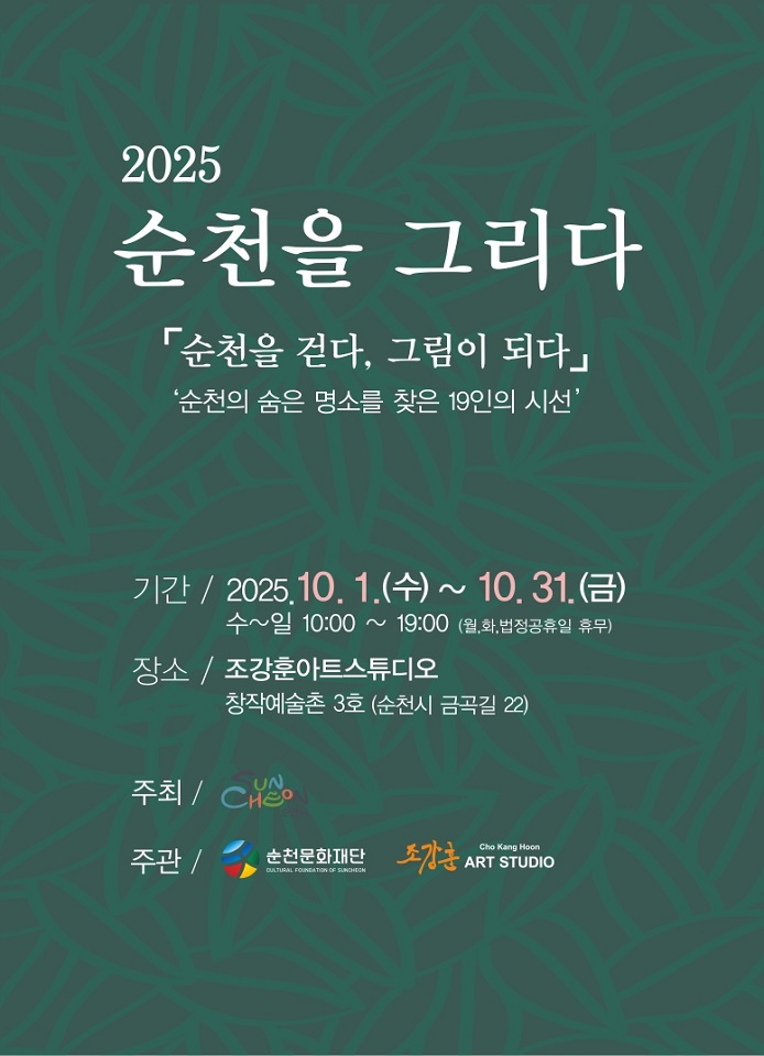 순천문화재단(이사장 노관규)은 오는 10월 1일(수) 오후 5시 개전식을 시작으로 10월 31일(금)까지 순천창작예술촌 3호 조강훈 아트 스튜디오에서 「순천을 그리다 - 순천을 걷다, 그림이 되다」 전시를 개최한다.