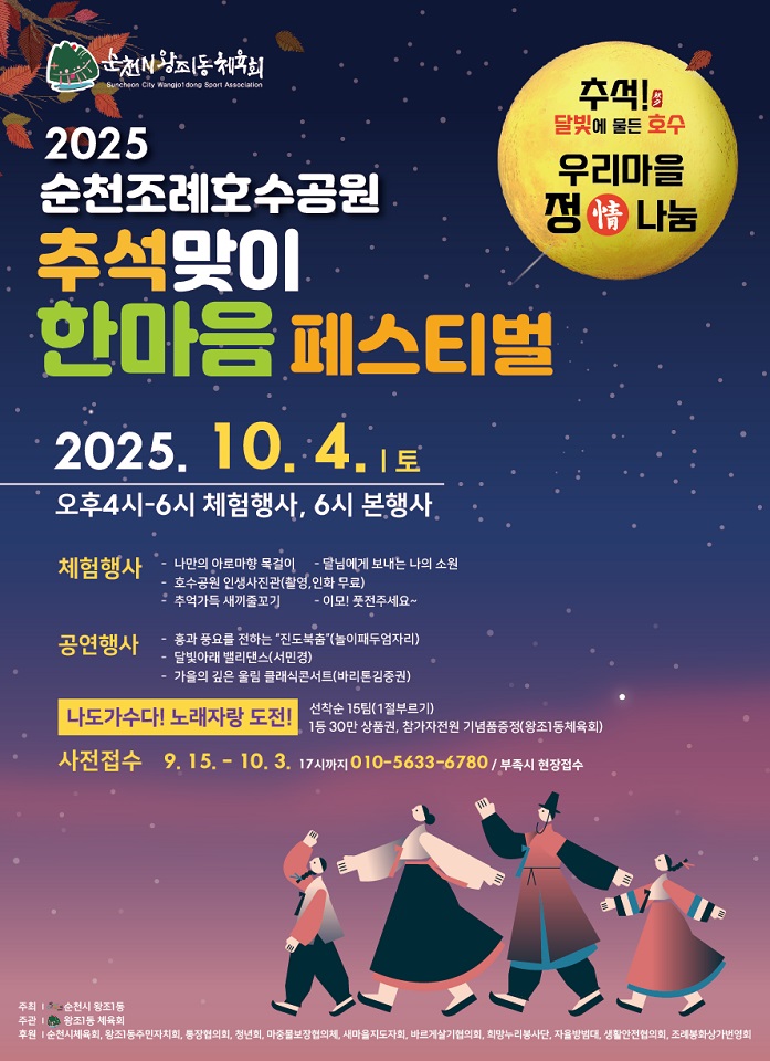 이번 축제는 ‘추석! 달빛에 물든 호수, 우리마을 정나눔’이라는 주제로 열리며, 세대와 이웃이 함께 참여할 수 있는 전통 체험과 공연 프로그램이 다채롭게 마련되어 명절 분위기를 한층 북돋울 예정이다.