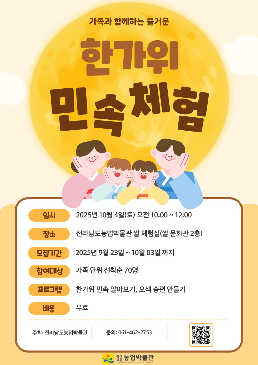 전라남도 농업박물관은 다가오는 한가위를 맞아 가족 단위 관람객 대상으로 ‘한가위 민속 체험행사’를 10월 4일에 개최한다고 밝혔다.