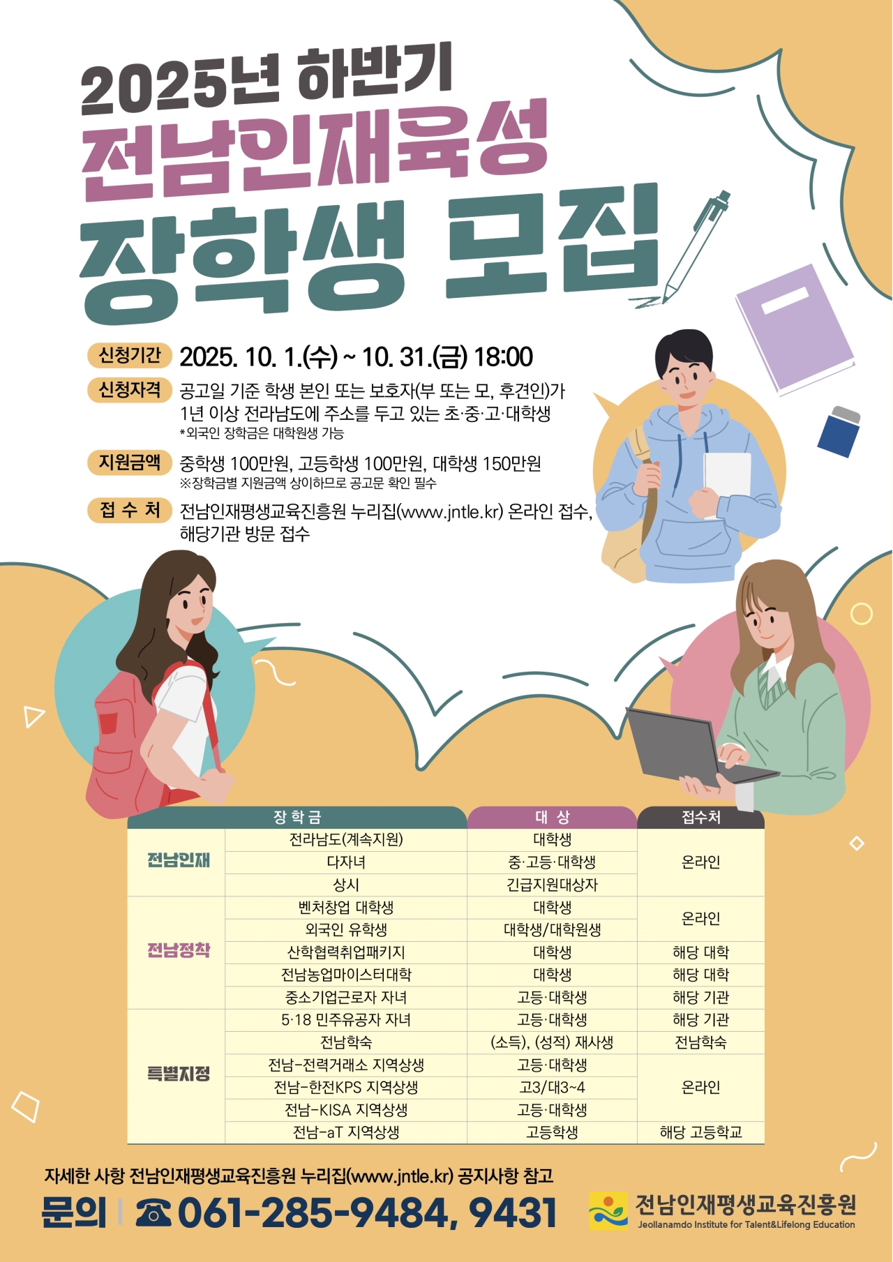 전라남도와 전남인재평생교육진흥원은 실질적인 교육기회 보장과 미래인재로의 성장, 지역 정착을 지원하기 위한 2025년 하반기 전남인재육성 장학생을 오는 31일까지 모집한다.