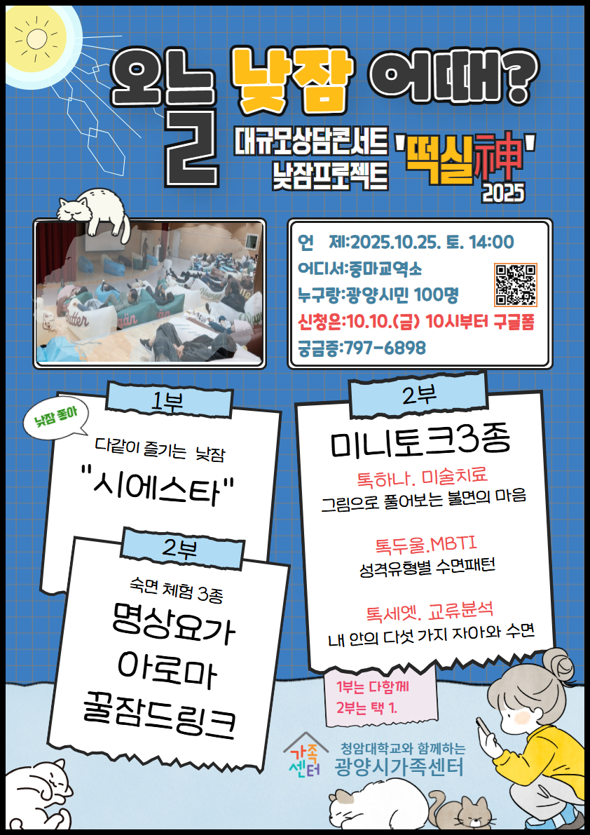 광양시가족센터는 오는 10월 25일 오후 2시, 중마교역소에서 광양시민과 함께하는 대규모 상담콘서트 ‘낮잠 프로젝트 떡실神’을 운영한다고 밝혔다.
