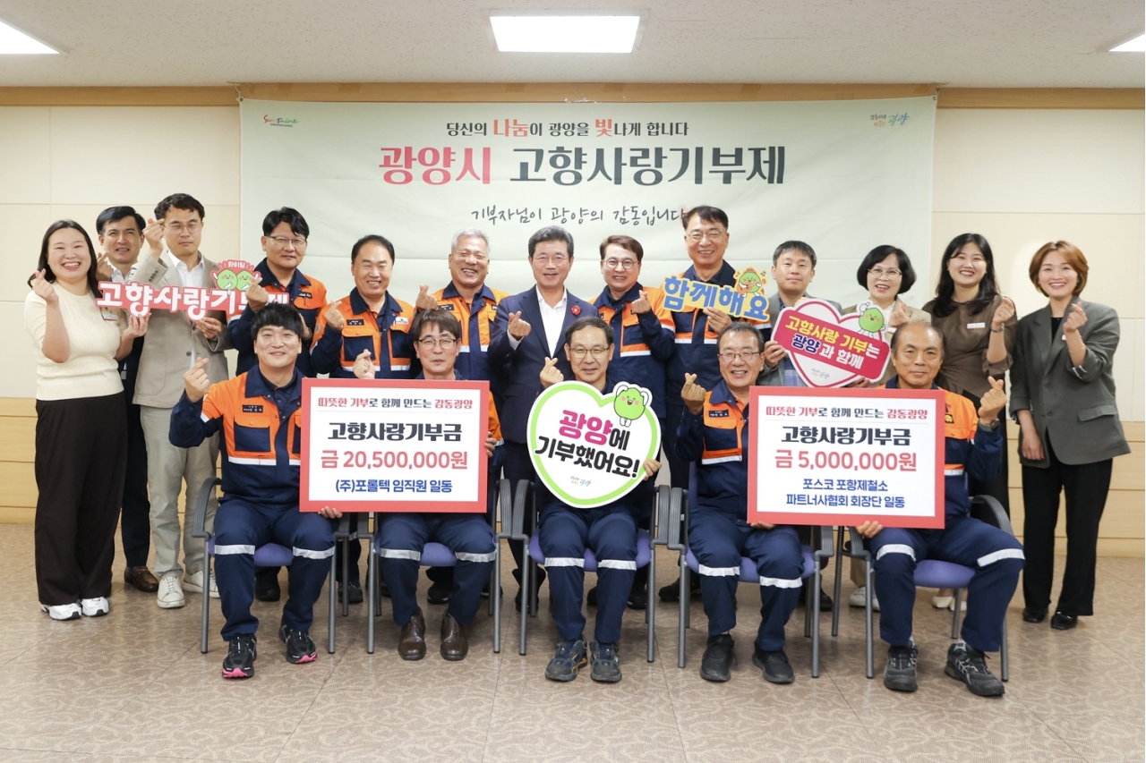 특히 포스코 포항제철소 파트너사협회 회장단은 지난해에도 광양시에 500만 원을, ㈜포롤텍 임직원 일동은 2,060만 원을 기부한 바 있어 2년 연속으로 고향사랑기부제에 참여하며 변함없는 마음을 이어가고 있다.