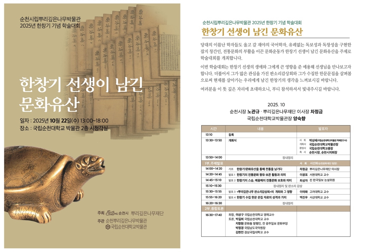 이번 학술대회는 한창기 선생에 관심이 있는 순천시민 누구나 참여할 수 있으며 자세한 사항은 순천시립뿌리깊은나무박물관(061-749-8858)으로 문의하면 된다.