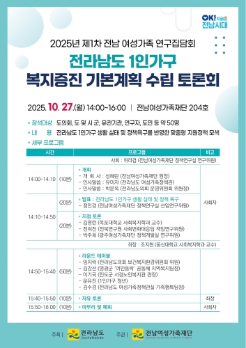 전남여성가족재단 ❏ 전라남도가 주최하고 전남여성가족재단이 주관하는 ‘전라남도 1인가구 복지증진 기본계획 수립...