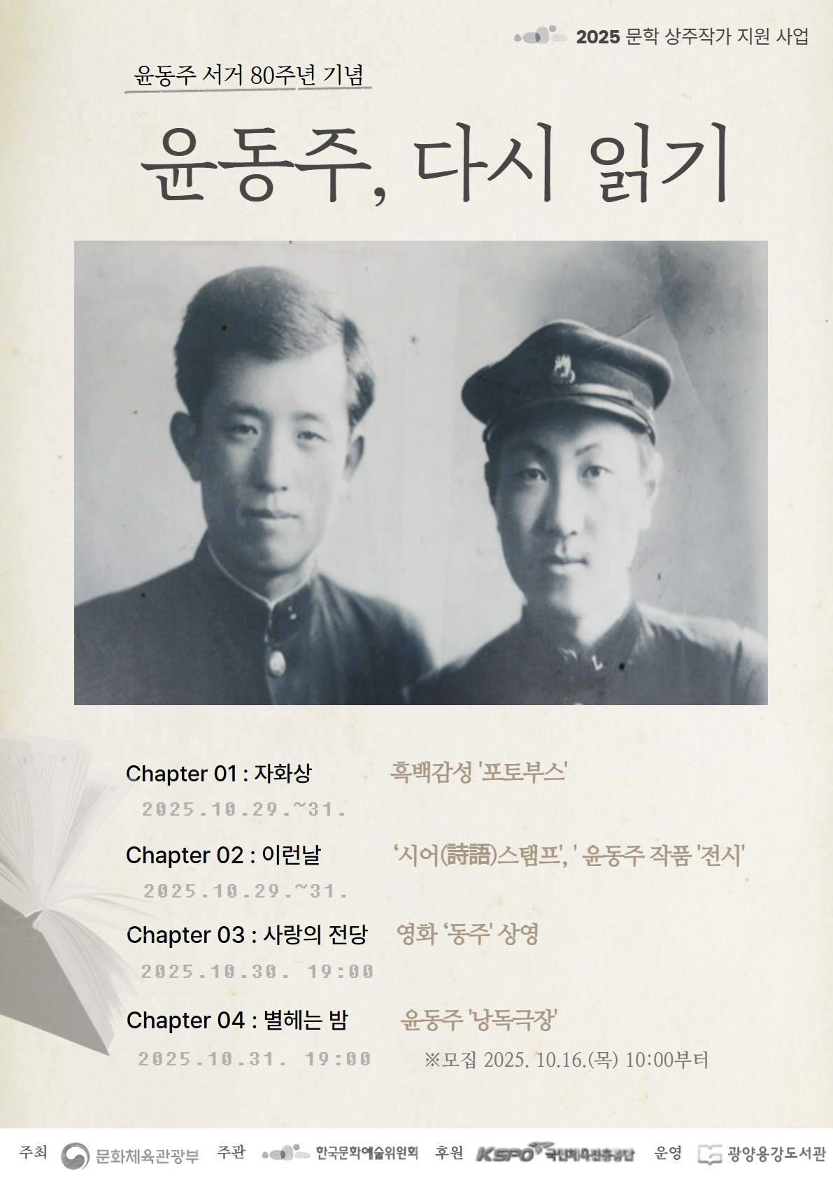 광양용강도서관이 윤동주 서거 80주년을 맞아 오는 10월 29일부터 31일까지 그의 삶과 작품세계를 다양한 방식으로 조명하는 프로그램 「윤동주, 다시 읽기」를 운영한다.