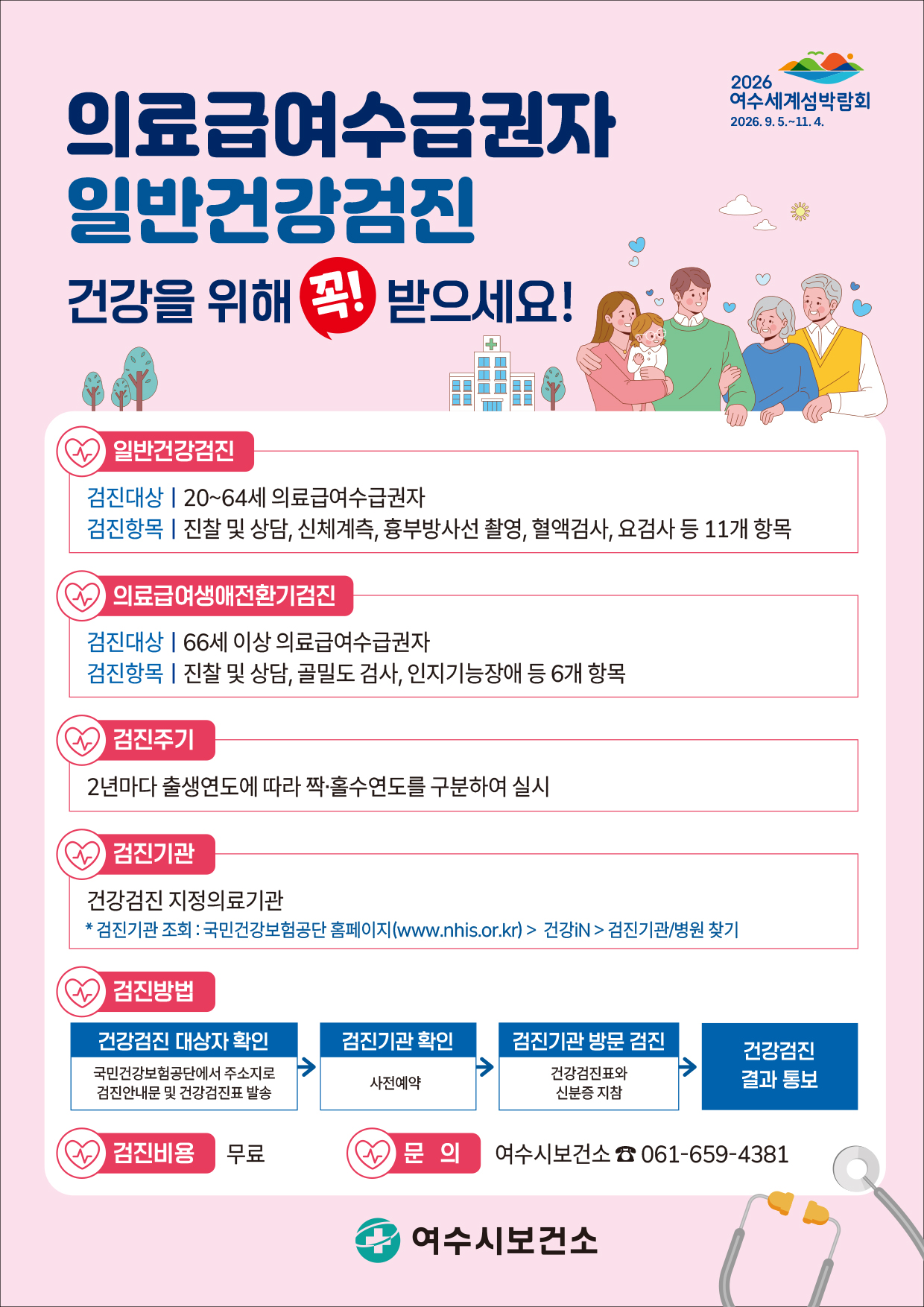 여수시(시장 정기명)는 의료취약계층의 질환을 조기에 발견하고 시민 건강을 증진하기 위해 의료급여수급권자의 일반건강검진 수검을 적극 독려하고 있다.
