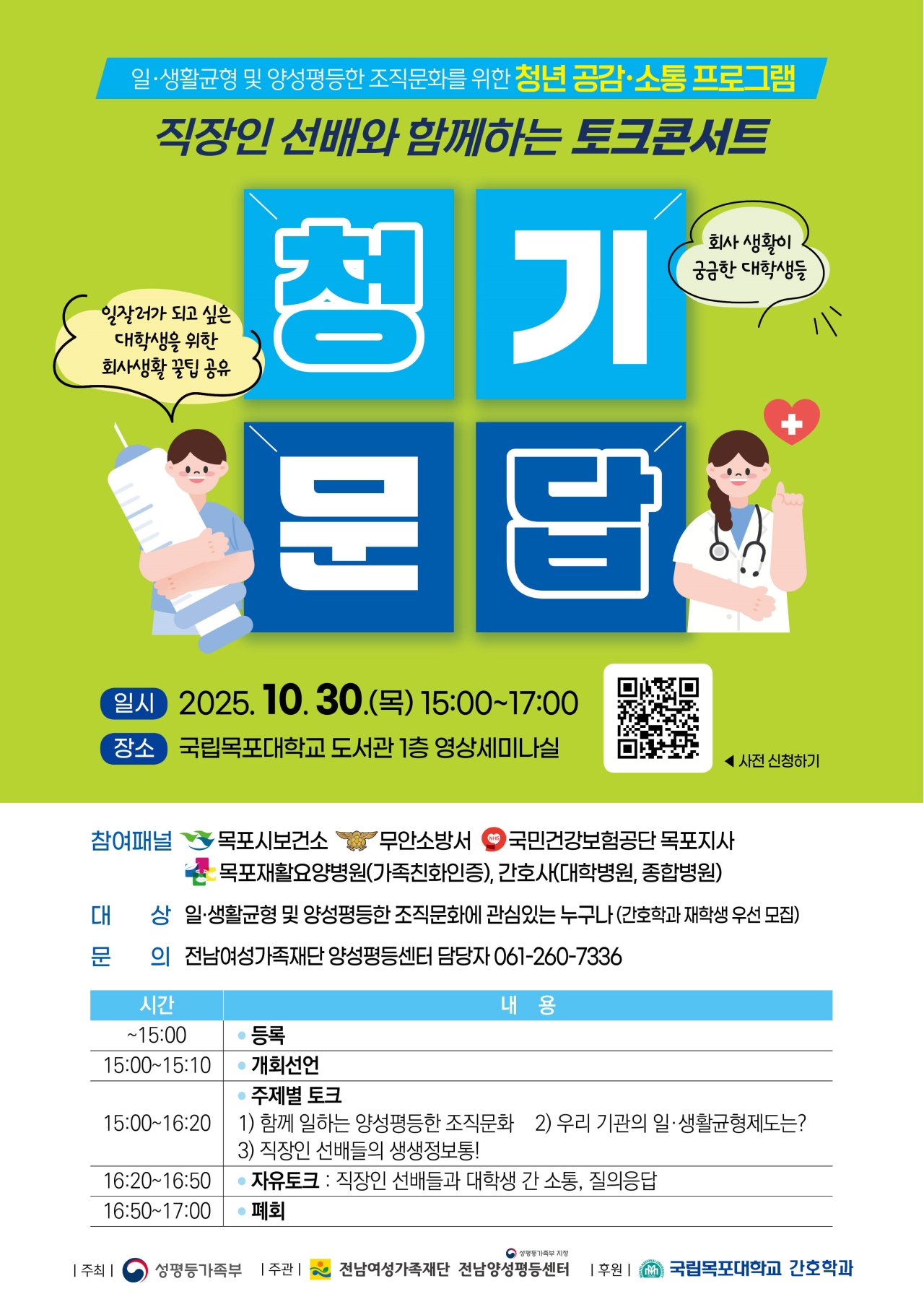 ❏ 전남여성가족재단은 지난 10월 30일(목), 국립목포대학교에서 전남 지역 청년들과 보건 계열 선배 종사자들이 함께 모여 일·생활균형 및 평등한 조직문화를 주제로 자유롭게 소통하는 ‘청기문답’ 프로그램을 개최했다.