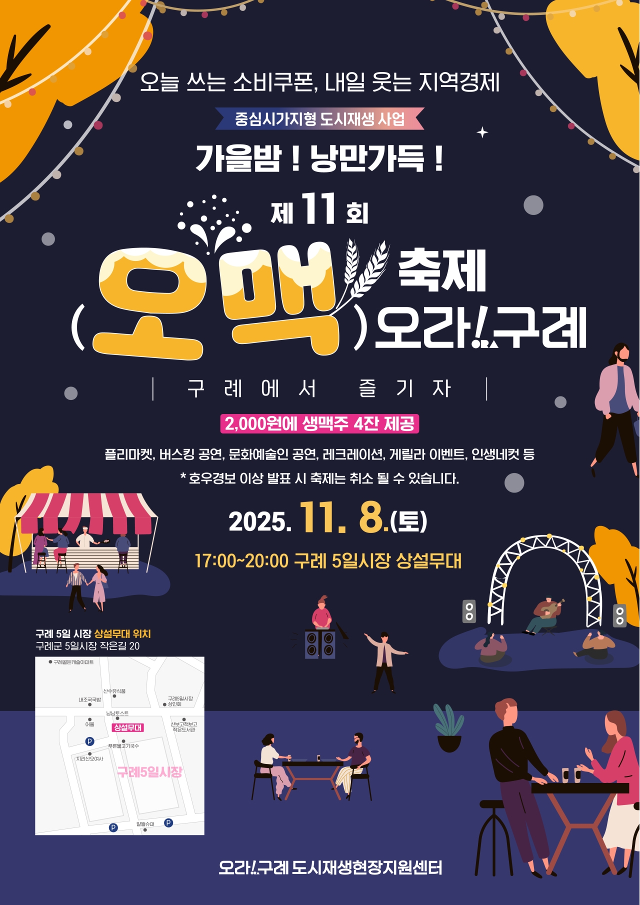 오후 5시 개회식을 시작으로 가수 주태령, 정소라, 김한나, 러브어스 앙상블의 무대가 이어지며, 가을밤을 낭만적인 음악으로 물들일 예정이다. 현장에서는 500원에 500cc 생맥주 1잔(1인 최대 4잔)을 제공하며, 안전하게 즐길 수 있도록 교환권(쿠폰) 제도를 운영한다.