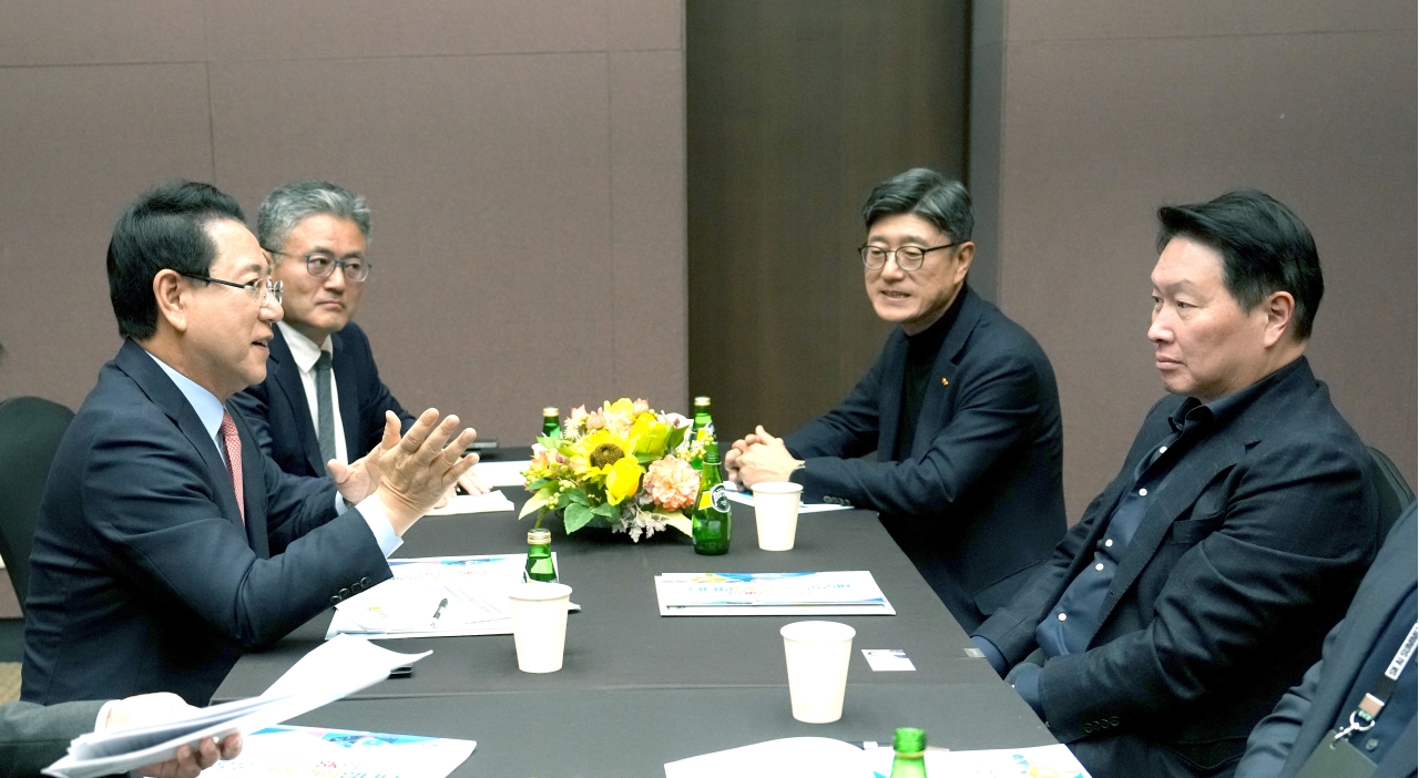 김영록 전라남도지사가 3일 서울 코엑스에서 열린 ‘SK AI SUMMIT 2025’에서 최태원 SK그룹 회장을 만나 SK-오픈AI 합동 ‘글로벌 AI 데이터센터’ 구축 협력 방안을 논의했다.