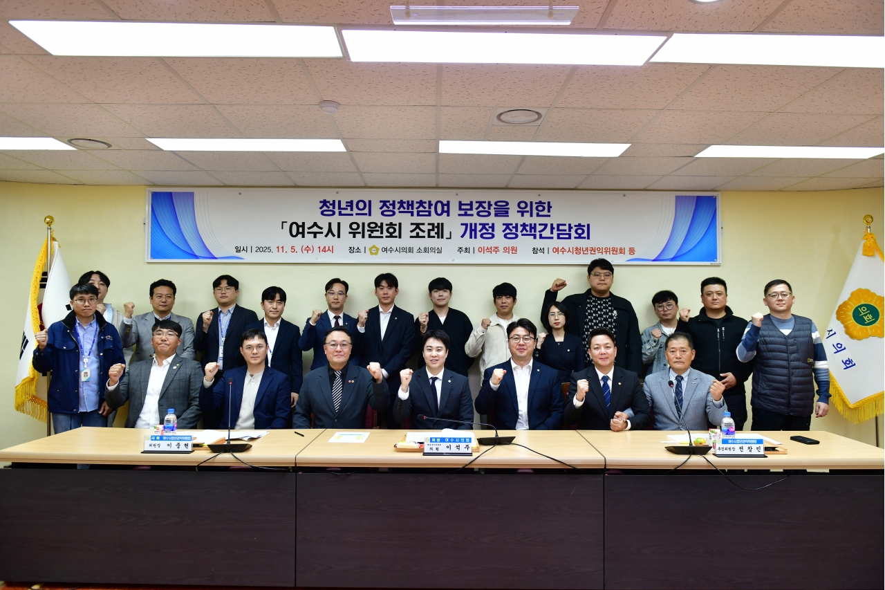 여수시의회(의장 백인숙)는 11월 5일(화) 오후 2시 시의회 소회의실에서 「청년의 정책참여 보장을 위한 ‘여수시 위원회 조례’ 개정 정책간담회」를 개최했다.