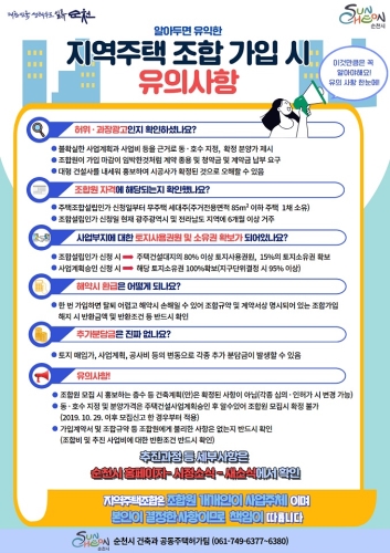 순천시 순천시(시장 노관규)는 최근 지역주택조합 아파트 사업과 관련해 과장 광고나 불충분한 정보 제공으로 인...