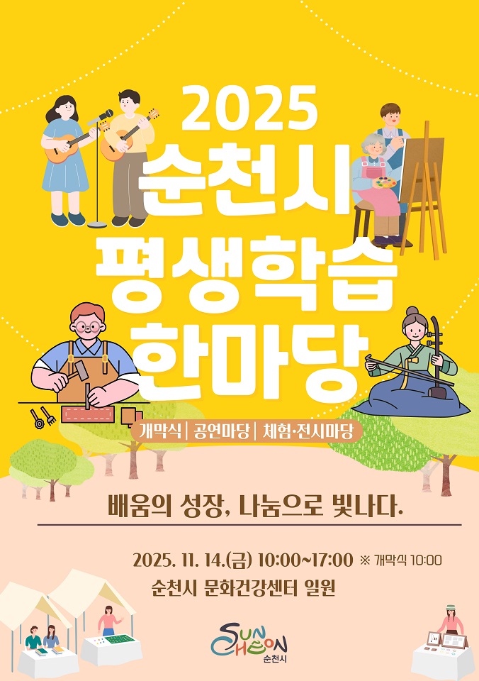 순천시(시장 노관규)는 오는 14일 순천시문화건강센터 일원에서 ‘배움의 성장, 나눔으로 빛나다’를 주제로 ‘2025 순천시 평생학습 한마당’을 개최한다.