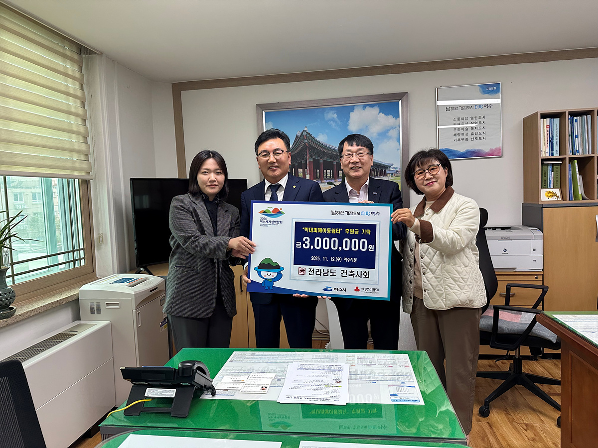 여수시(시장 정기명)는 대한건축사협회 전라남도건축사회(회장 이경일)가 지난 12일 학대피해 아동 지원을 위해 지역 학대피해아동쉼터에 후원금 300만 원을 전달했다고 밝혔다.