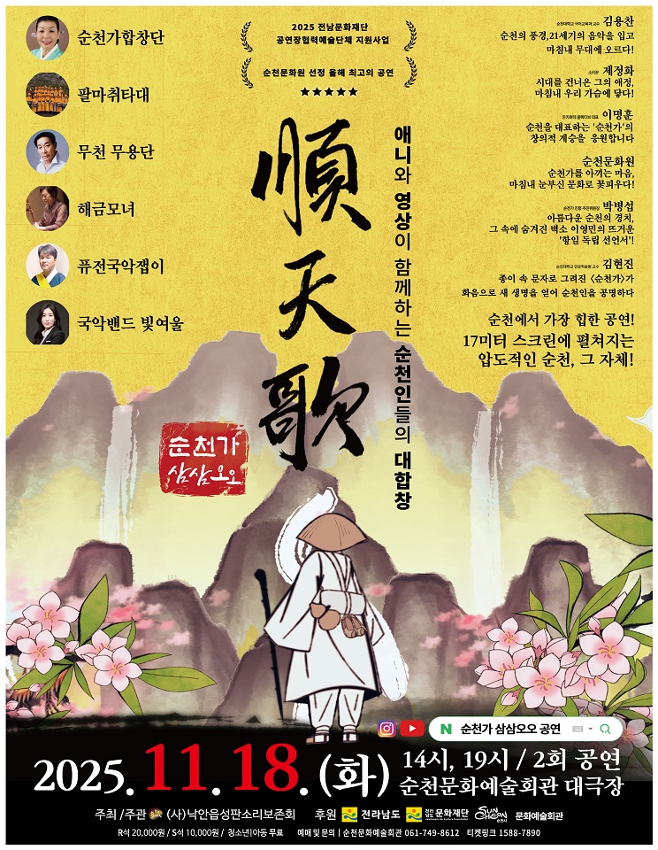 다양한 장르의 국악 콘텐츠가 어우러진 이번 무대는 순천가 여정의 시작과 끝을 알리는 ‘취타대’를 필두로, 순천의 넋을 기리는 ‘흑두루미춤(황경하 안무)’, 평화의 땅 낙안을 상징하는 ‘사물놀이패’, 그리고 호호가인의 애틋함을 담아낸 ‘해금 연주’ 등 순천을 대표하는 각 분야의 국악인이 총출동하여 무대를 빛낼 예정이다.