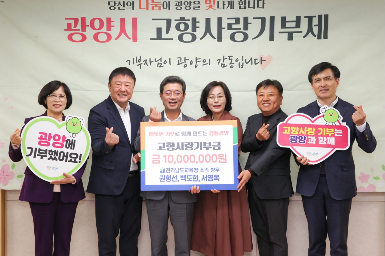 광양시는 전남교육청 소속 광양출신 향우 3명이 고향사랑의 뜻을 모아 총 1,000만 원의 고향사랑기부금을 전달했다고 밝혔다.