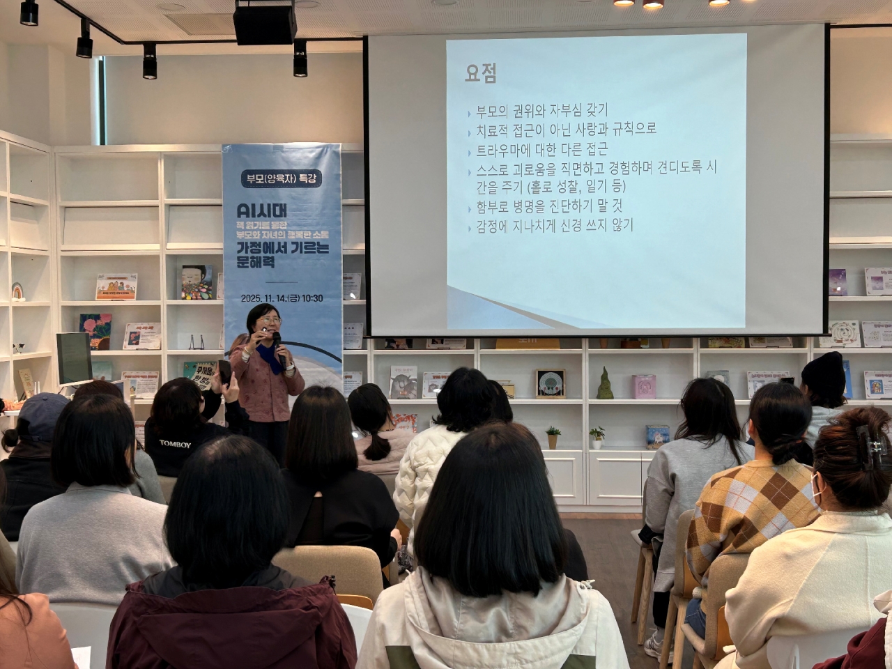 이번 강연은 ‘AI 시대 가정에서 기르는 문해력’을 주제로 진행됐으며, 스마트 기기에 익숙한 자녀 세대의 특성을 이해하는 데 필요한 내용과 함께 가정에서 실천할 수 있는 책 읽어주기 방법, 효과적인 대화법 등을 소개했다. 또한 부모들을 위한 추천도서를 안내했으며, 강연 후에는 질의응답과 저자 사인회도 이어졌다.