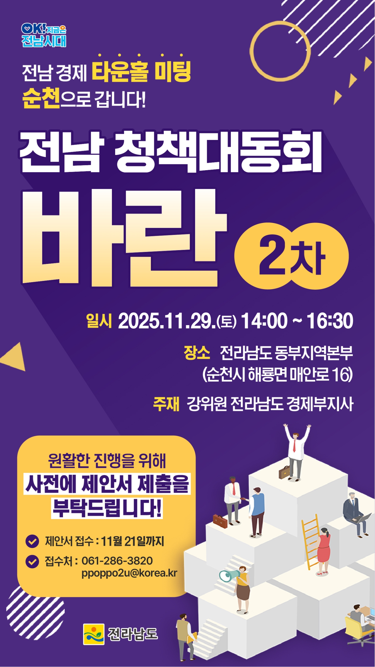 지난 9월 전남도청에서 개최했던 1차 행사처럼, 강위원 경제부지사와 정책 제안자가 직접 만나 정책 제안을 청취하고 의견을 나누는 열린 토론장으로 마련된다.