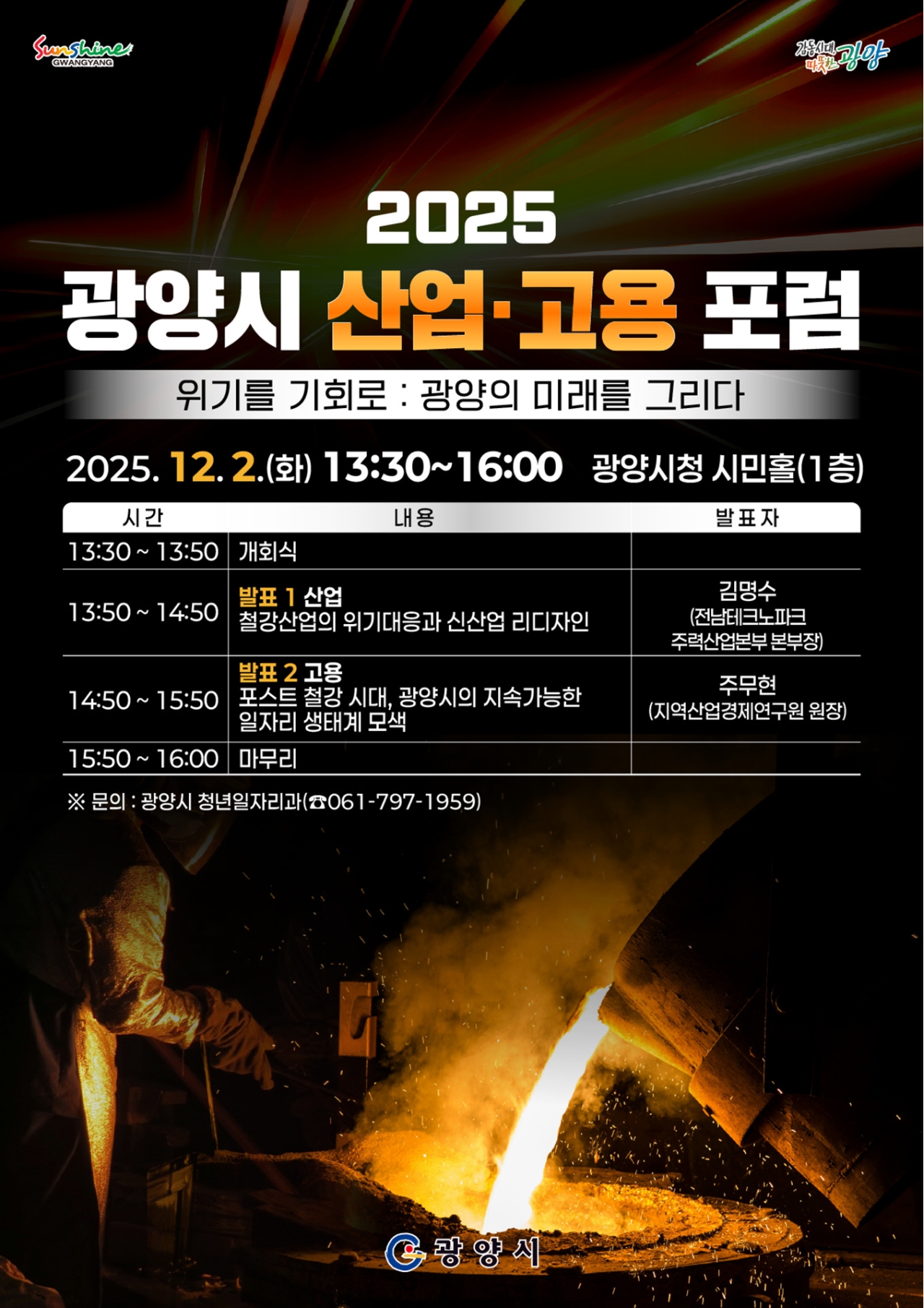 광양시는 오는 12월 2일(화) 오후 1시 30분, 시청 시민홀에서 ‘2025 광양시 산업‧고용 포럼’을 개최한다고 밝혔다.
